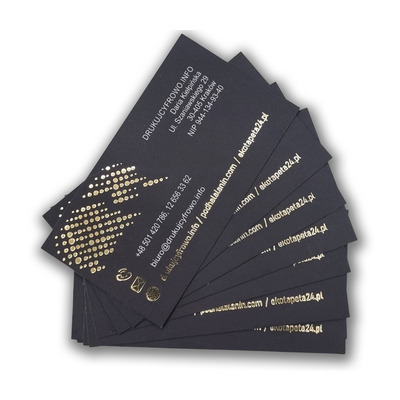 Wizytówki wykonujemy z wykorzystaniem pełnokolorowego druku w technologii CMYK. Drukujemy na różnych typach papieru – standardowo używamy papieru kredowego o gramaturze 300-350 g, dostępne są również papiery satynowane. Wizytówki złocone 3D mogą być foliowane folią matową, Soft Touch, Antiscratch lub matową folią laminacyjną 100 micr. Następnie wybrane elementy wizytówki są uszlachetniane folią złotą lub srebrną metodą Hot Stampingu za pomocą matrycy. Takie wykończenie nadaje jej eleganckiego i wyjątkowego wyglądu. Produkujemy wersje z prostymi lub zaokrąglonymi narożnikami.