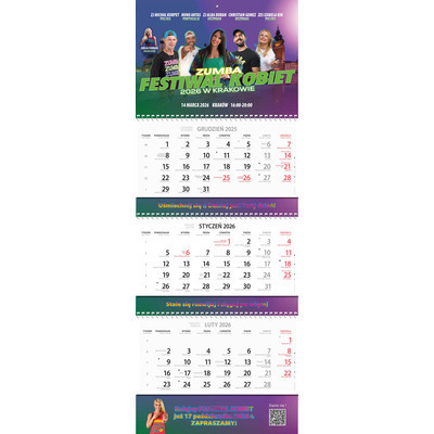 Kalendarz czterodzielny FK Ten niezwykły kalendarz to idealne narzędzie do planowania Twojego czasu! W Twoim domu to źródło niezapomnianych wspomnień z Festiwalu Kobiet. Specyfikacja:wymiar po rozłożeniu 330mmx960mmpapier: karton 280 g + offset 80 gdruk: pełnokolorowyuszlachetnienia: Główka folia błyszcząca dwustronnieinstroligatornia: spirala, okienko Dodaj pliki Stop Ilość stron powinna zawierać się pomiędzy 1 a 9999999 Wypełnij zamówienie NAKŁAD Rozmiar 330x960 mm Wykończenie Srebrna spirala Opakowanie -------- Woreczek foliowy Dodatkowe informacje Kalkulacja dla Ciebie Dodaj do koszyka